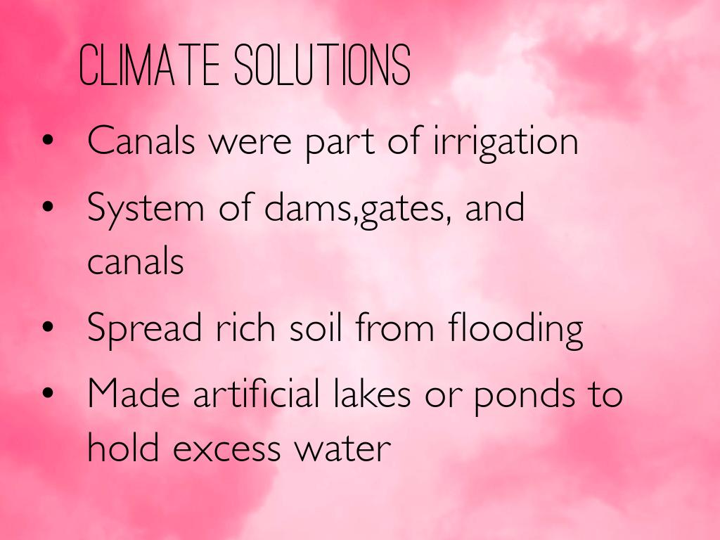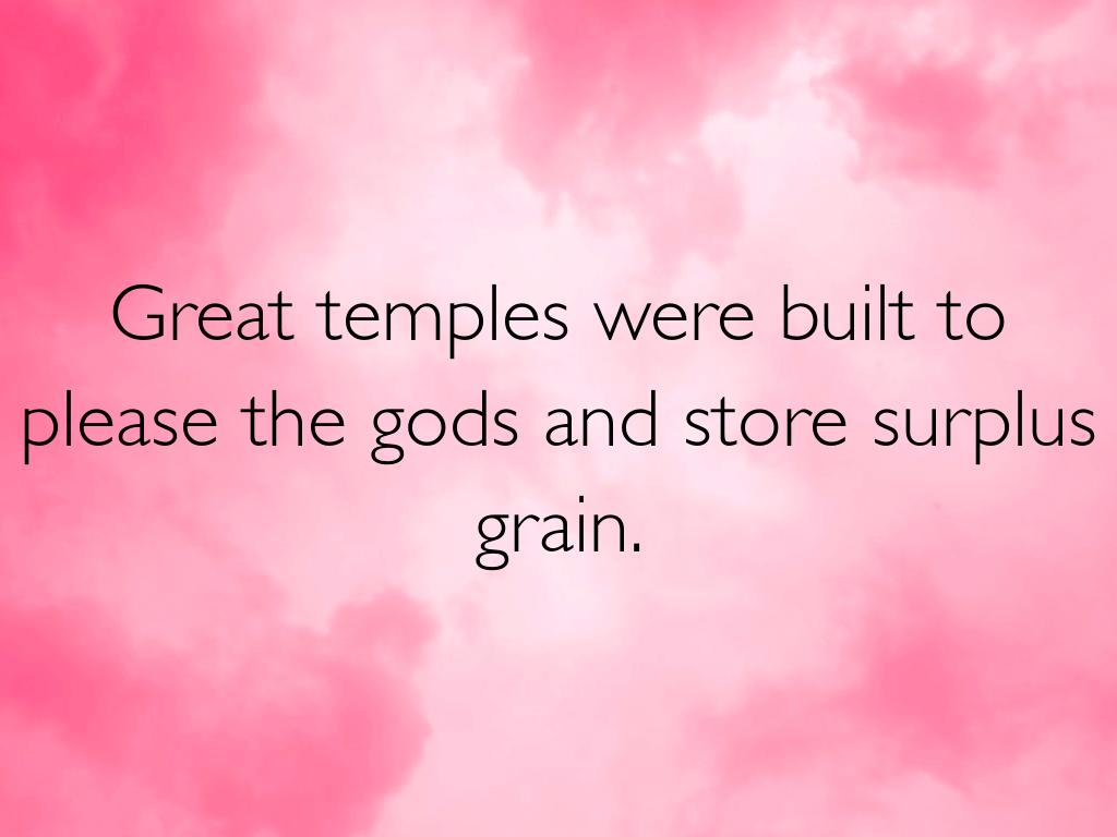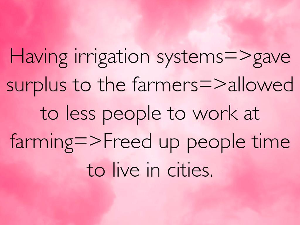 Having irrigation systems=>gave surplus to the farmers=>allowed to less people to work at farming=>Freed up people time to live in cities.
