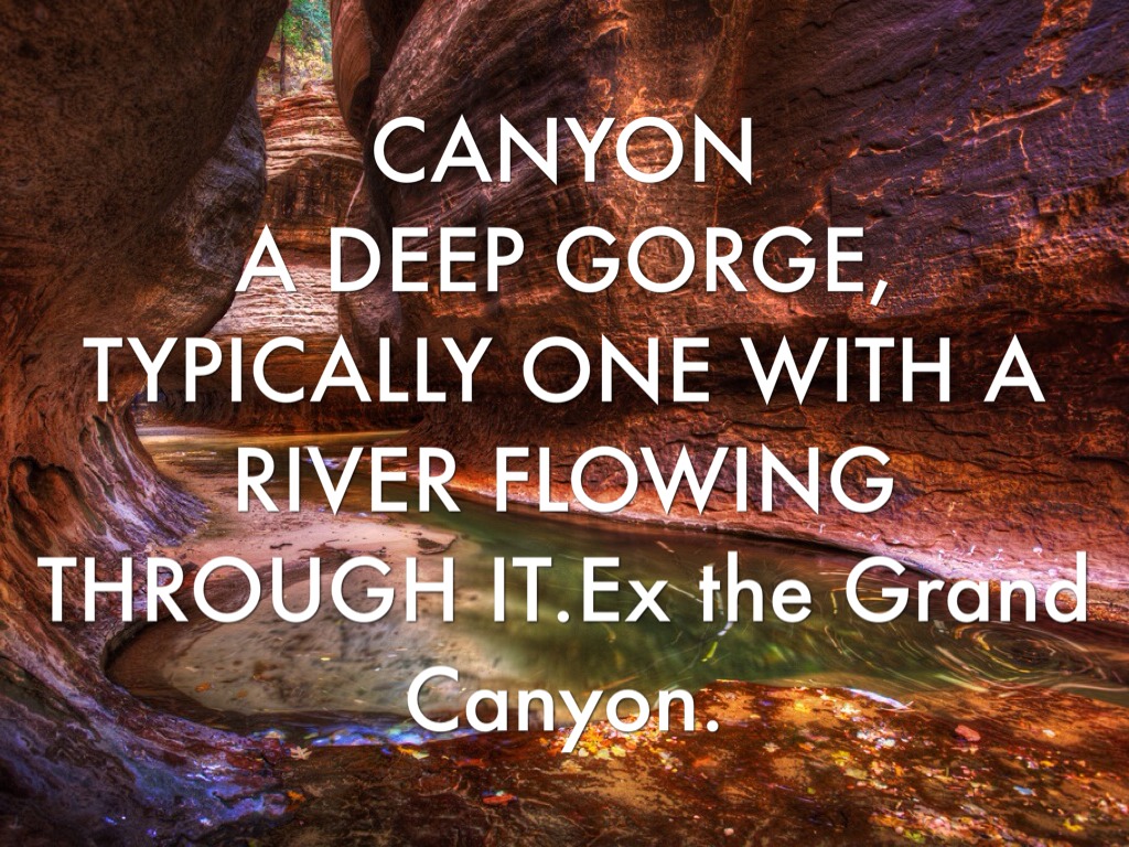 A DEEP GORGE, TYPICALLY ONE WITH A RIVER FLOWING THROUGH IT.Ex the Grand Canyon.