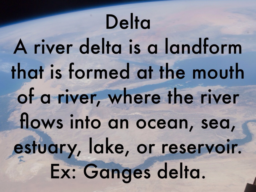 A river delta is a landform that is formed at the mouth of a river, where the river flows into an ocean, sea, estuary, lake, or reservoir. Ex: Ganges delta.