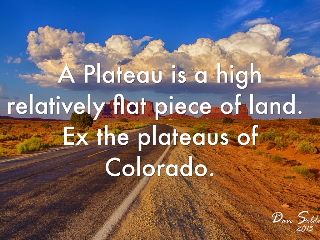A Plateau is a high relatively flat piece of land. Ex the plateaus of Colorado.