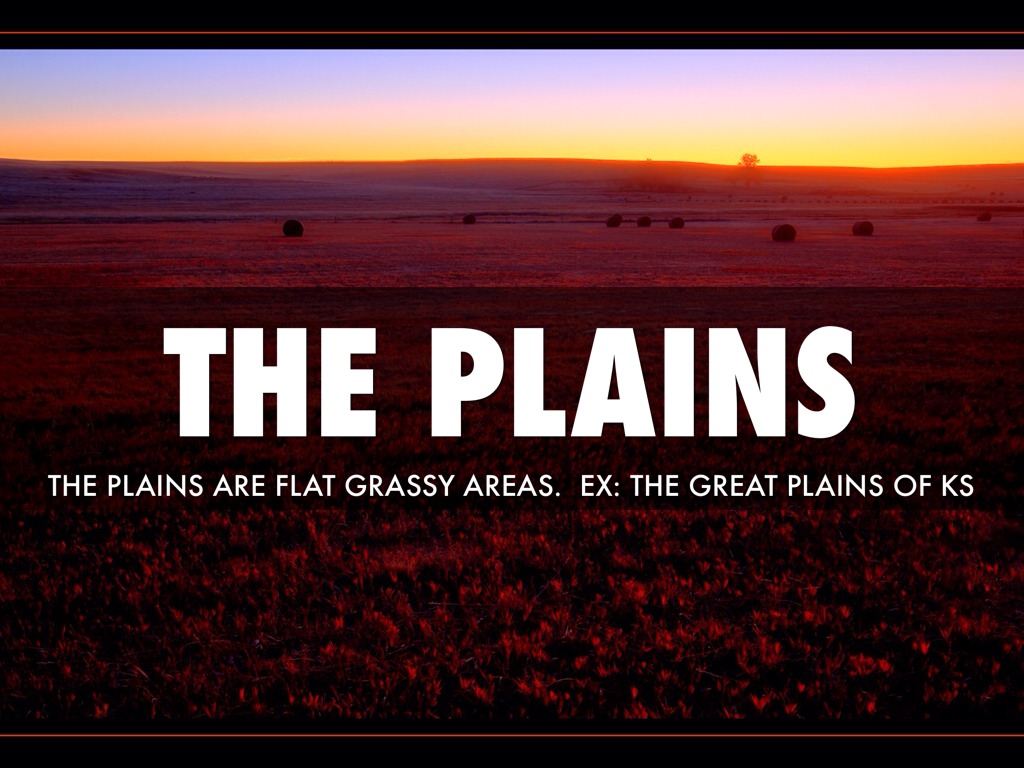 THE PLAINS ARE FLAT GRASSY AREAS. EX: THE GREAT PLAINS OF KS