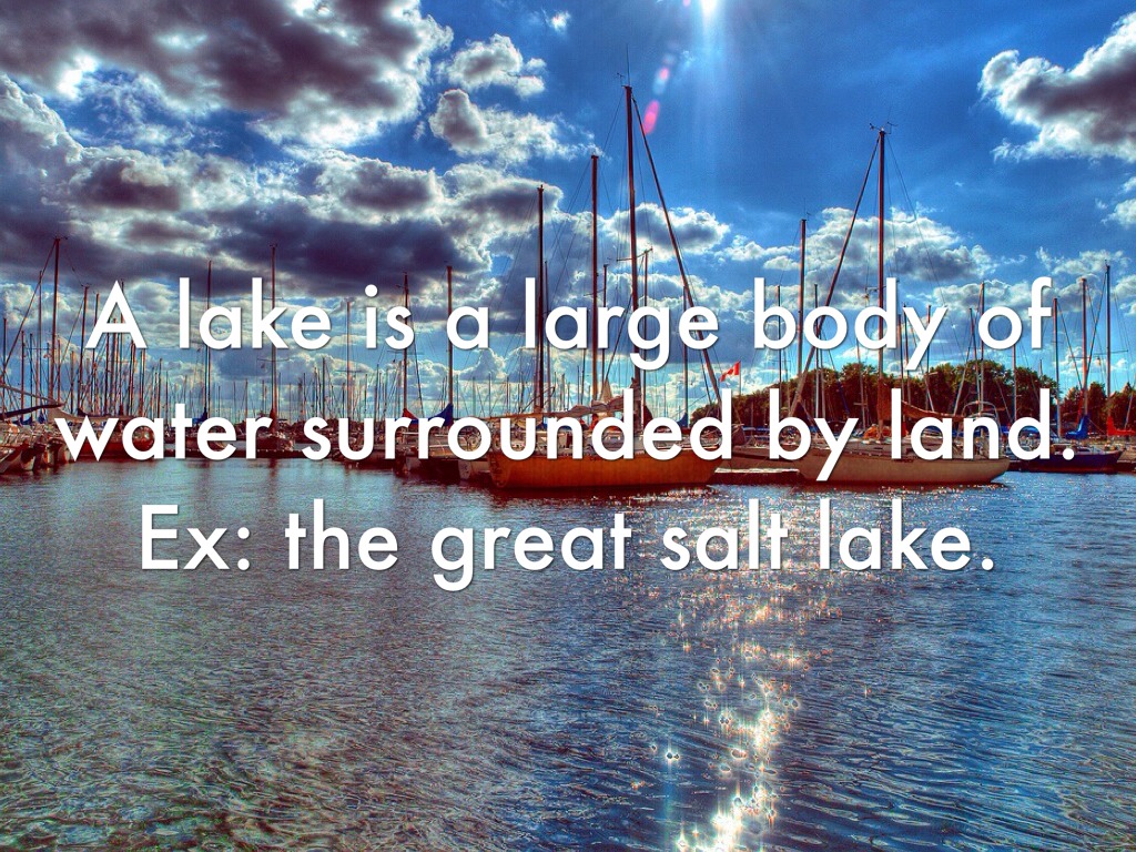 A lake is a large body of water surrounded by land. Ex: the great salt lake.