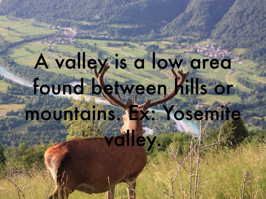 A valley is a low area found between hills or mountains. Ex: Yosemite valley.