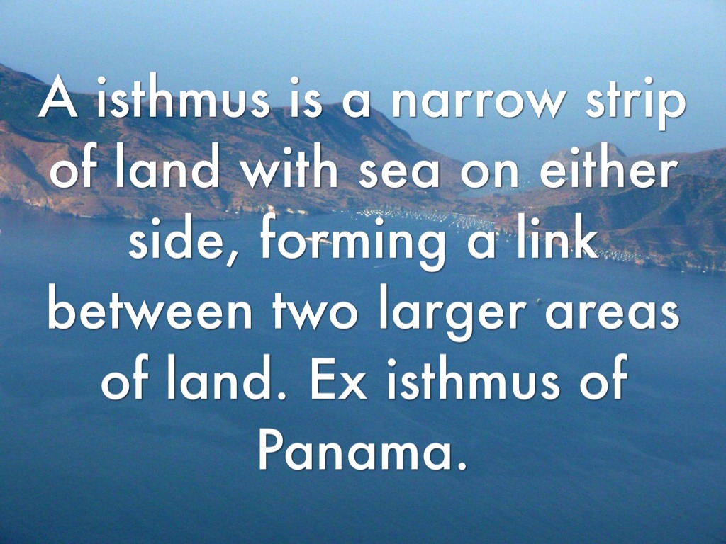 A isthmus is a narrow strip of land with sea on either side, forming a link between two larger areas of land. Ex isthmus of Panama.