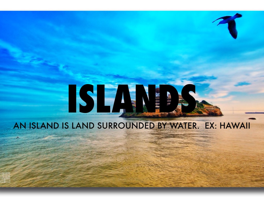 AN ISLAND IS LAND SURROUNDED BY WATER. EX: HAWAII