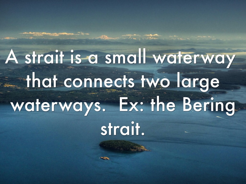 A strait is a small waterway that connects two large waterways. Ex: the Bering strait.