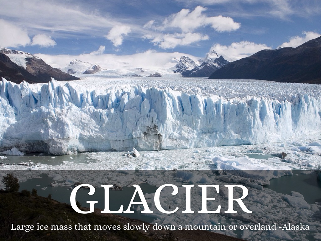 Large ice mass that moves slowly down a mountain or overland -Alaska