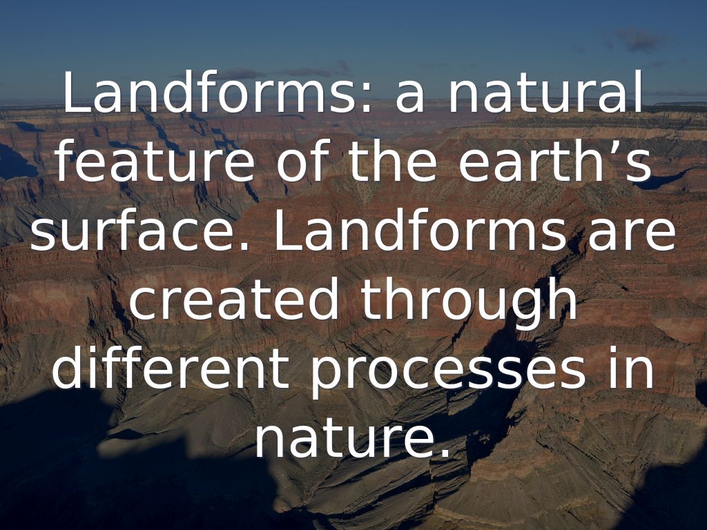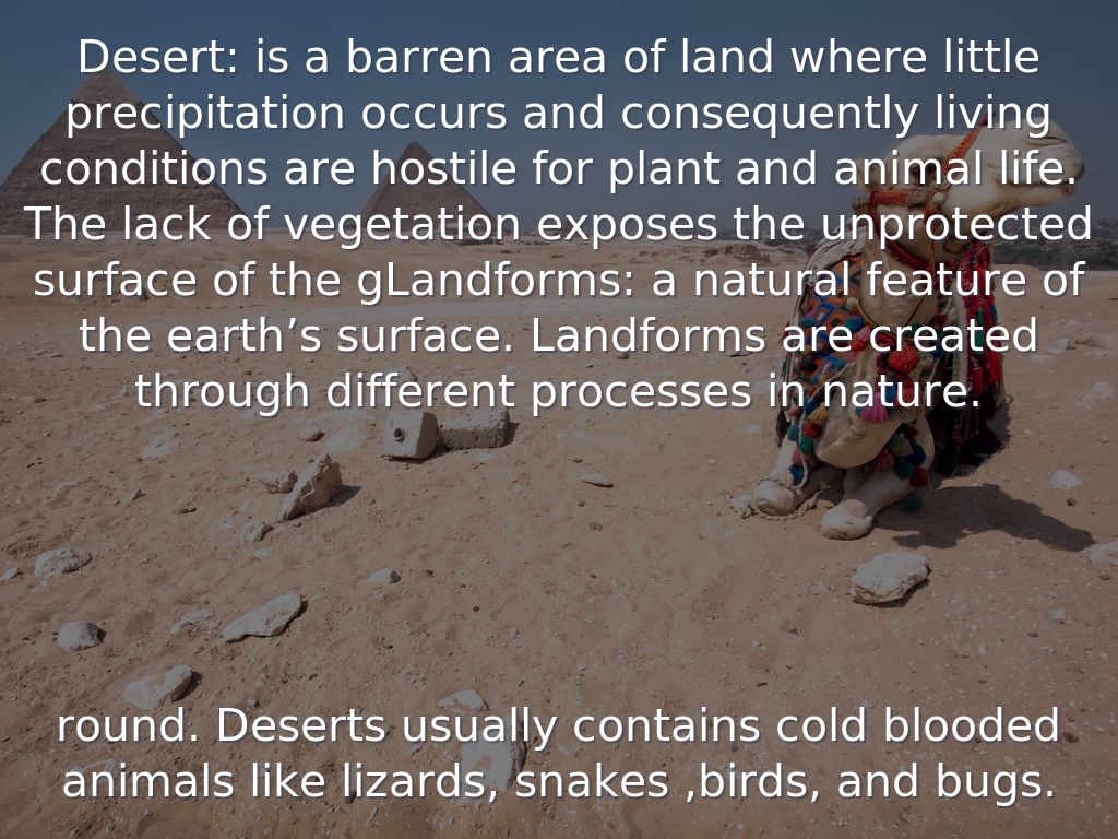Desert: is a barren area of land where little precipitation occurs and consequently living conditions are hostile for plant and animal life. The lack of vegetation exposes the unprotected surface of the gLandforms: a natural feature of the earth’s surface. Landforms are created through different processes in nature.