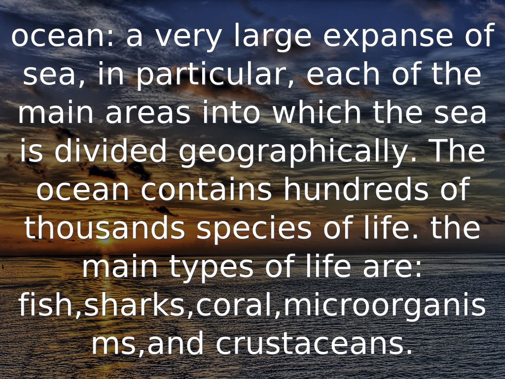 ocean: a very large expanse of sea, in particular, each of the main areas into which the sea is divided geographically. The ocean contains hundreds of thousands species of life. the main types of life are: fish,sharks,coral,microorganisms,and crustaceans.