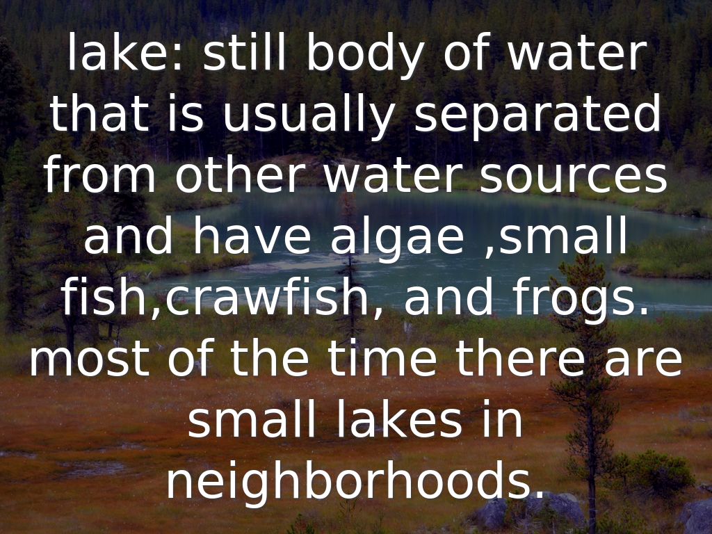 lake: still body of water that is usually separated from other water sources and have algae ,small fish,crawfish, and frogs. most of the time there are small lakes in neighborhoods.