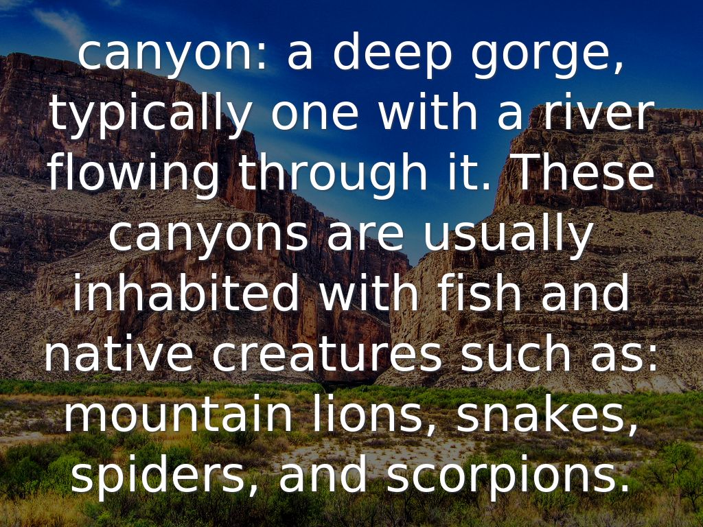 canyon: a deep gorge, typically one with a river flowing through it. These canyons are usually inhabited with fish and native creatures such as: mountain lions, snakes, spiders, and scorpions.