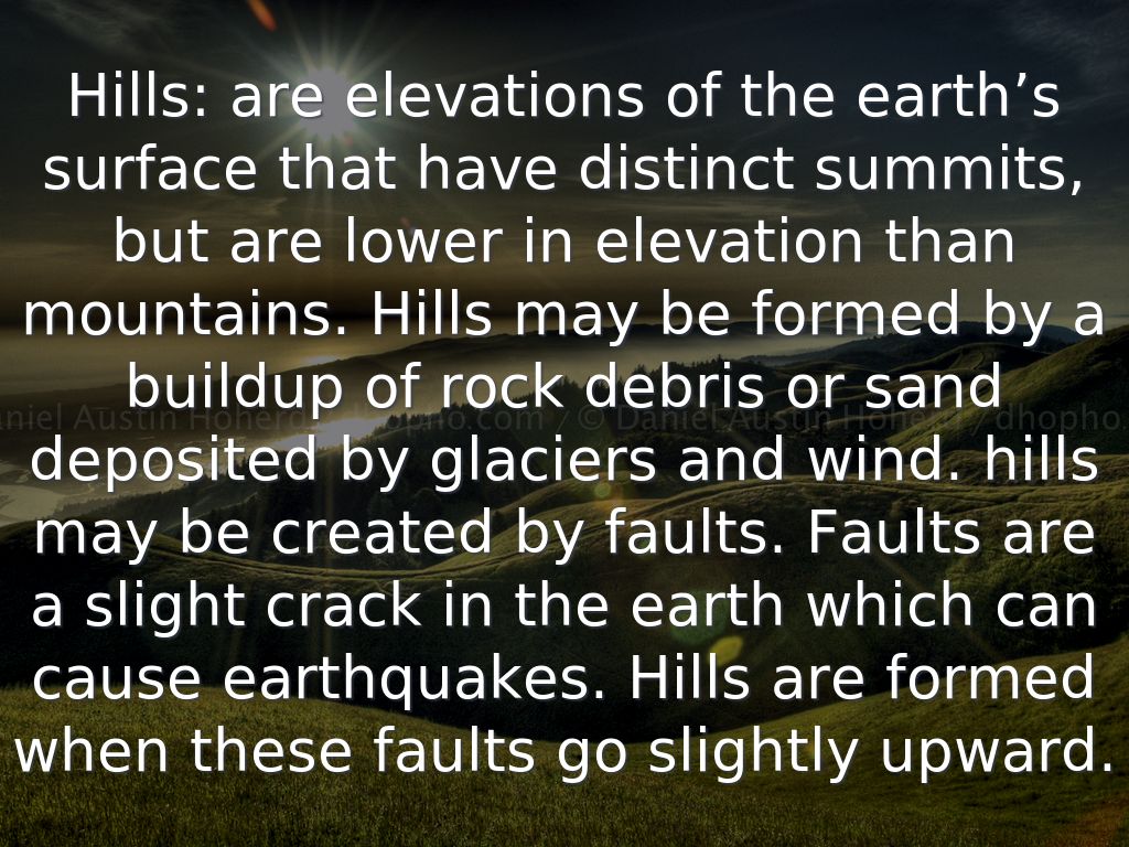 Hills: are elevations of the earth’s surface that have distinct summits, but are lower in elevation than mountains. Hills may be formed by a buildup of rock debris or sand deposited by glaciers and wind. hills may be created by faults. Faults are a slight crack in the earth which can cause earthquakes. Hills are formed when these faults go slightly upward.