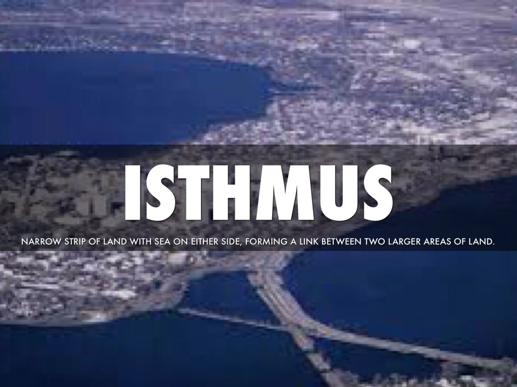 NARROW STRIP OF LAND WITH SEA ON EITHER SIDE, FORMING A LINK BETWEEN TWO LARGER AREAS OF LAND.