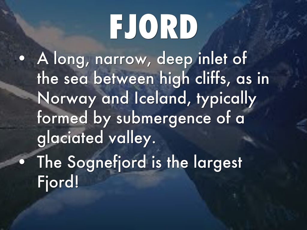 • A long, narrow, deep inlet of the sea between high cliffs, as in Norway and Iceland, typically formed by submergence of a glaciated valley.