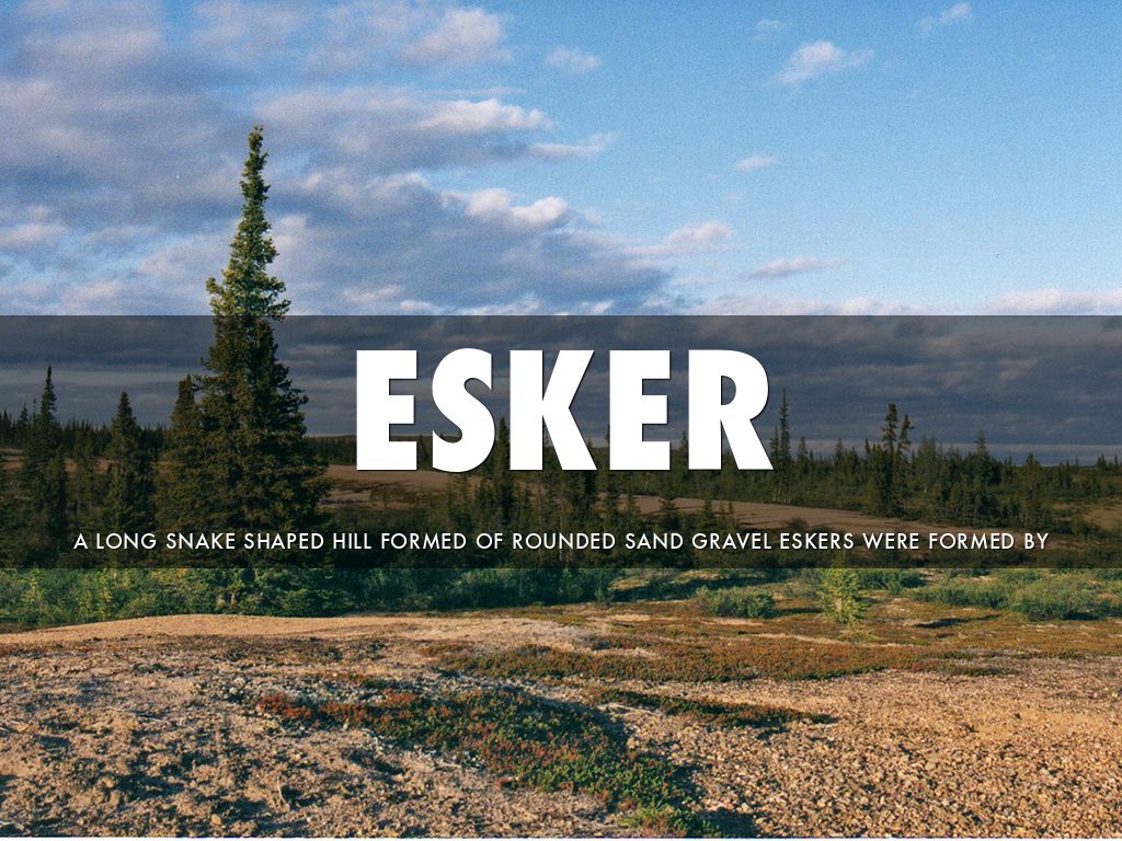 A LONG SNAKE SHAPED HILL FORMED OF ROUNDED SAND GRAVEL ESKERS WERE FORMED BY