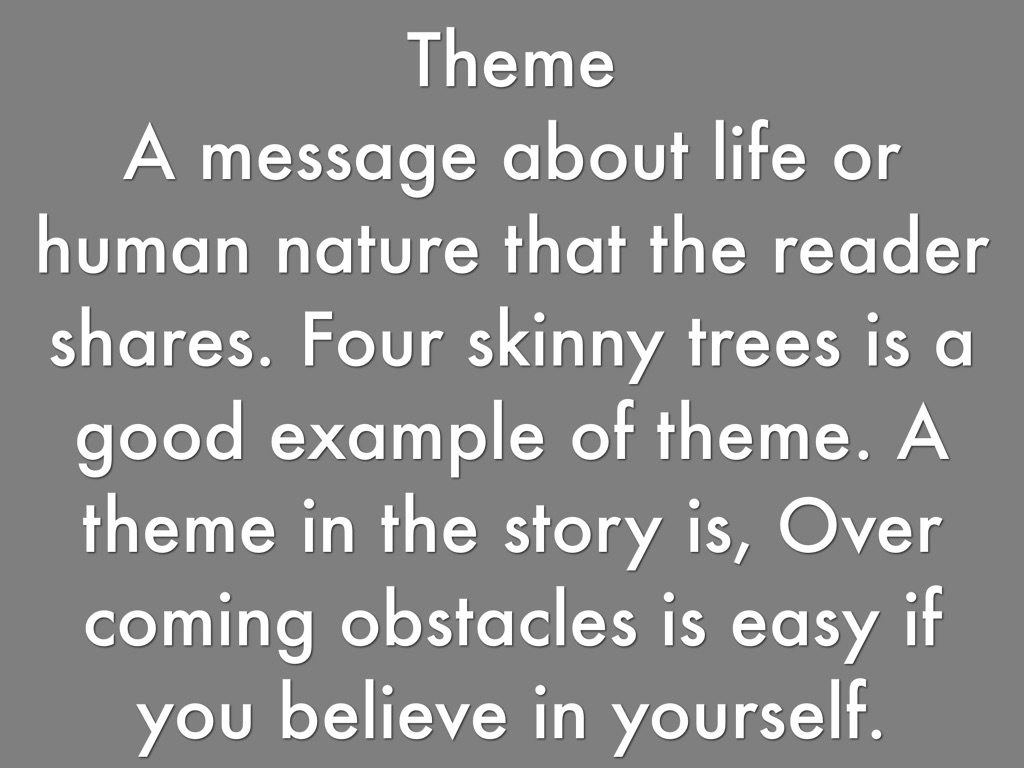 A message about life or human nature that the reader shares. Four skinny trees is a good example of theme. A theme in the story is, Over coming obstacles is easy if you believe in yourself.