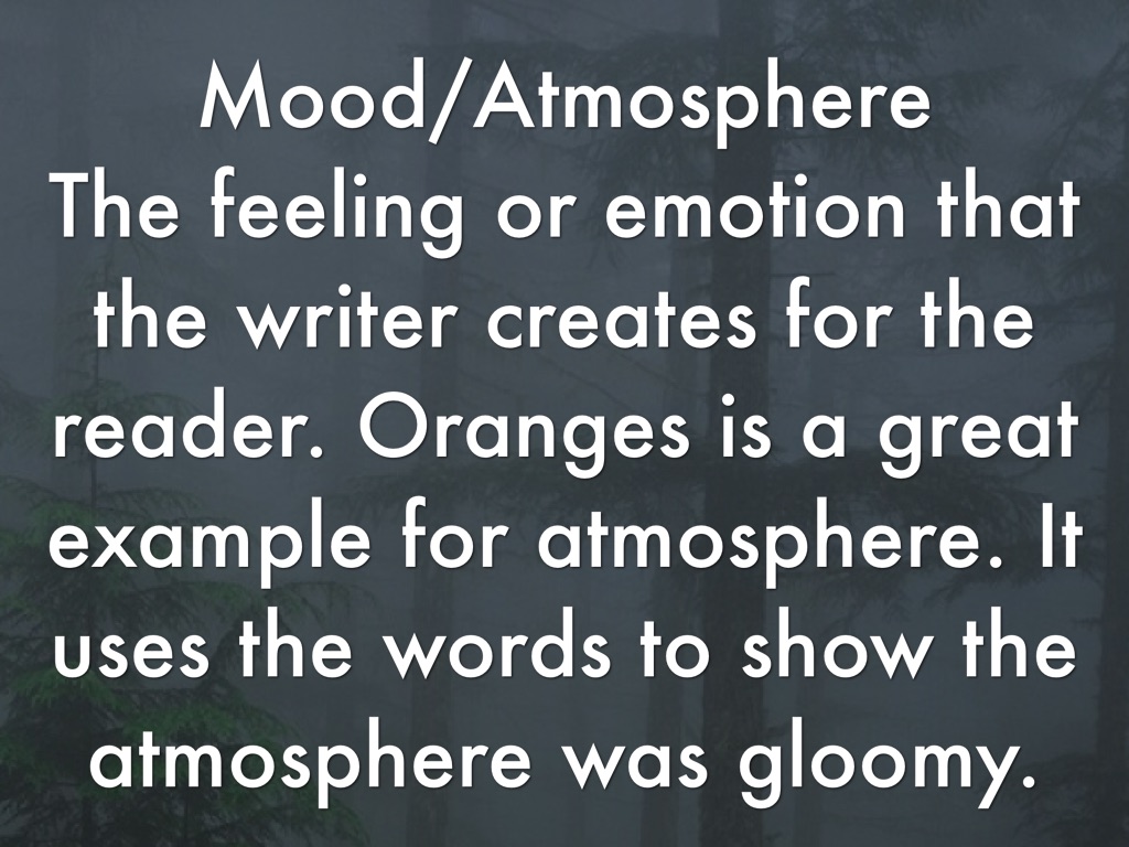 The feeling or emotion that the writer creates for the reader. Oranges is a great example for atmosphere. It uses the words to show the atmosphere was gloomy.