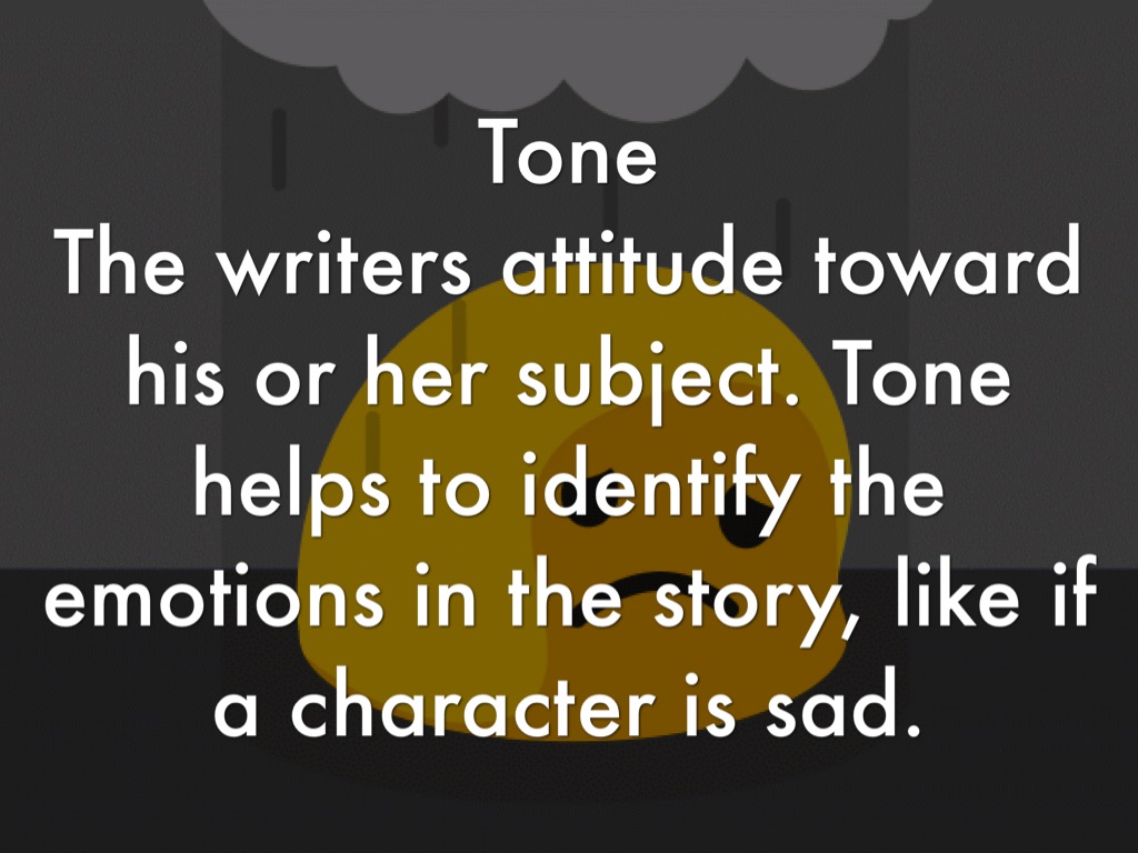 The writers attitude toward his or her subject. Tone helps to identify the emotions in the story, like if a character is sad.