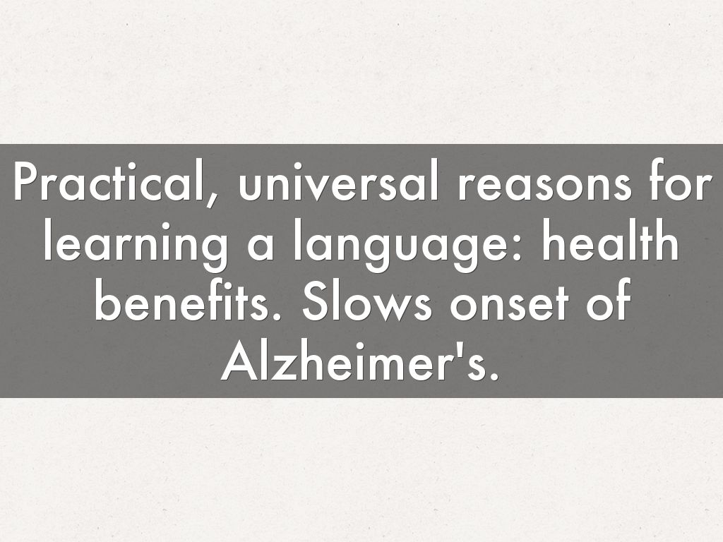 Practical, universal reasons for learning a language: health benefits. Slows onset of Alzheimer's.