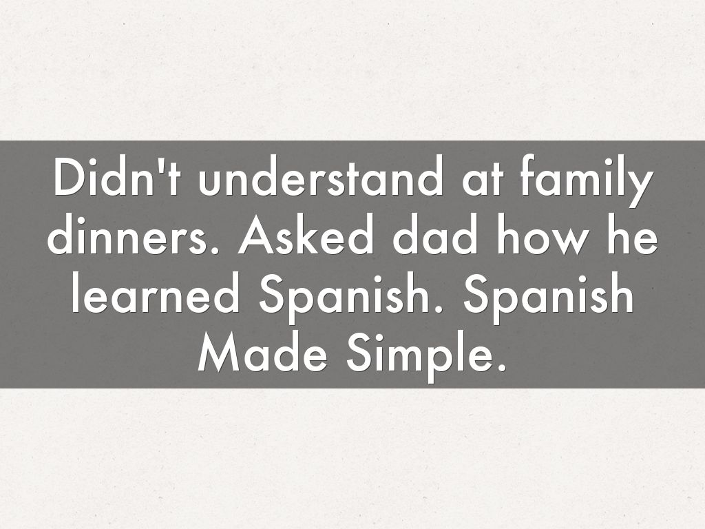 Didn't understand at family dinners. Asked dad how he learned Spanish. Spanish Made Simple.