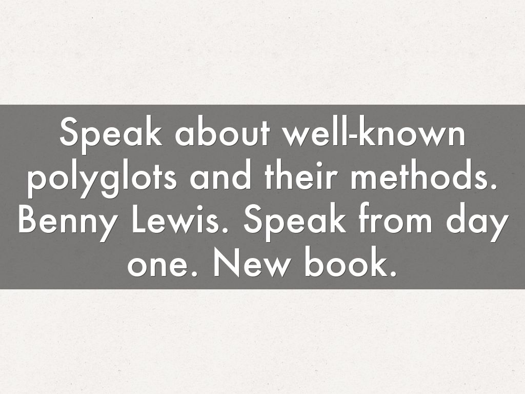 Speak about well-known polyglots and their methods. Benny Lewis. Speak from day one. New book.