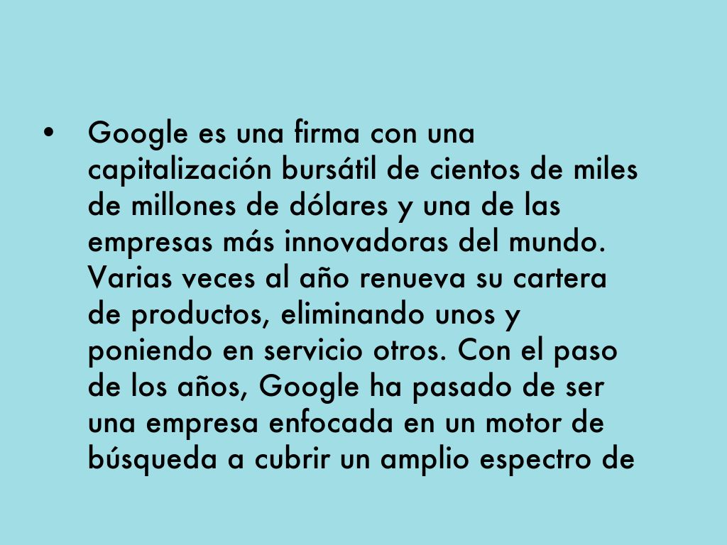 • Google es una firma con una capitalización bursátil de cientos de miles de millones de dólares y una de las empresas más innovadoras del mundo. Varias veces al año renueva su cartera de productos, eliminando unos y poniendo en servicio otros. Con el paso de los años, Google ha pasado de ser una empresa enfocada en un motor de búsqueda a cubrir un amplio espectro de sectores.