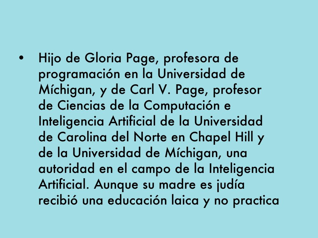 • Hijo de Gloria Page, profesora de programación en la Universidad de Míchigan, y de Carl V. Page, profesor de Ciencias de la Computación e Inteligencia Artificial de la Universidad de Carolina del Norte en Chapel Hill y de la Universidad de Míchigan, una autoridad en el campo de la Inteligencia Artificial. Aunque su madre es judía recibió una educación laica y no practica ninguna religión.