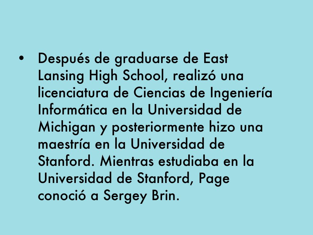 • Después de graduarse de East Lansing High School, realizó una licenciatura de Ciencias de Ingeniería Informática en la Universidad de Michigan y posteriormente hizo una maestría en la Universidad de Stanford. Mientras estudiaba en la Universidad de Stanford, Page conoció a Sergey Brin.