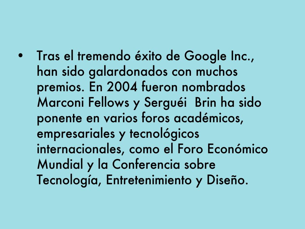• Tras el tremendo éxito de Google Inc., han sido galardonados con muchos premios. En 2004 fueron nombrados Marconi Fellows y Serguéi Brin ha sido ponente en varios foros académicos, empresariales y tecnológicos internacionales, como el Foro Económico Mundial y la Conferencia sobre Tecnología, Entretenimiento y Diseño.