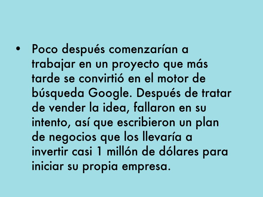 • Poco después comenzarían a trabajar en un proyecto que más tarde se convirtió en el motor de búsqueda Google. Después de tratar de vender la idea, fallaron en su intento, así que escribieron un plan de negocios que los llevaría a invertir casi 1 millón de dólares para iniciar su propia empresa.