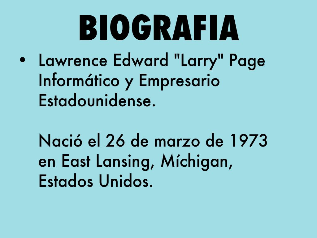 • Lawrence Edward "Larry" Page Informático y Empresario Estadounidense. Nació el 26 de marzo de 1973 en East Lansing, Míchigan, Estados Unidos.