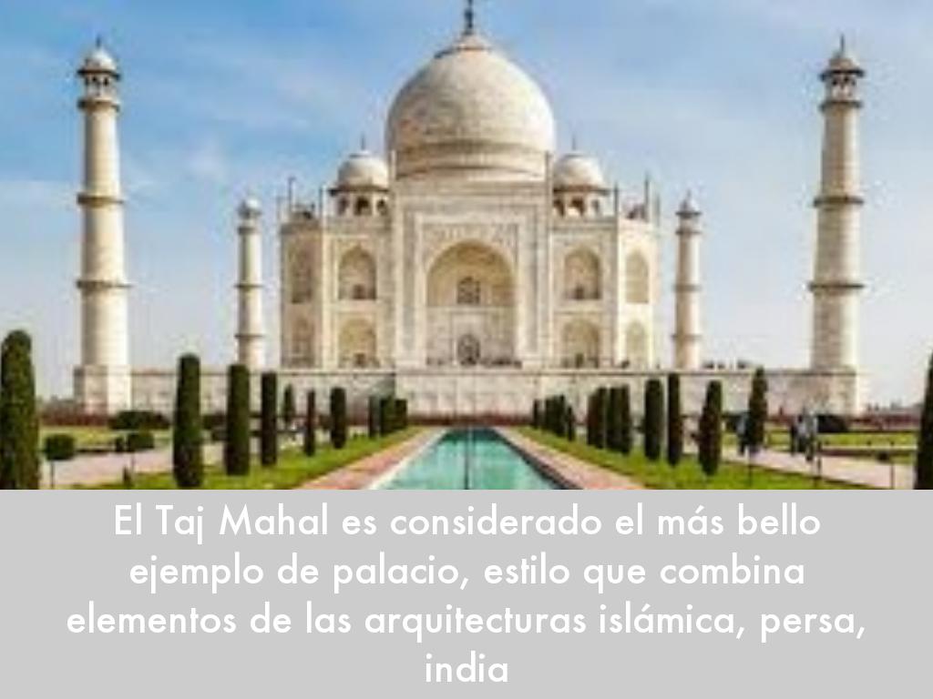 El Taj Mahal es considerado el más bello ejemplo de palacio, estilo que combina elementos de las arquitecturas islámica, persa, india