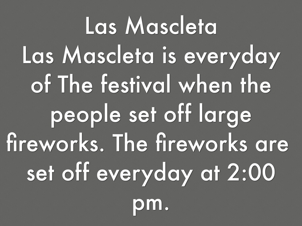 Las Mascleta is everyday of The festival when the people set off large fireworks. The fireworks are set off everyday at 2:00 pm.