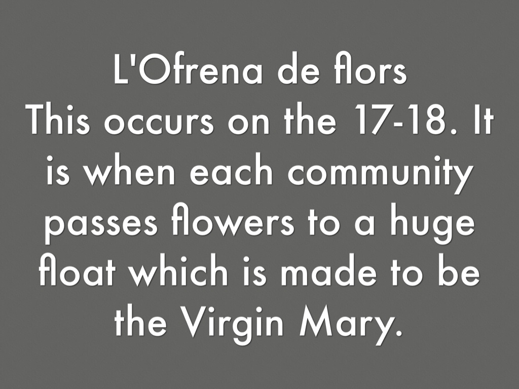 This occurs on the 17-18. It is when each community passes flowers to a huge float which is made to be the Virgin Mary.