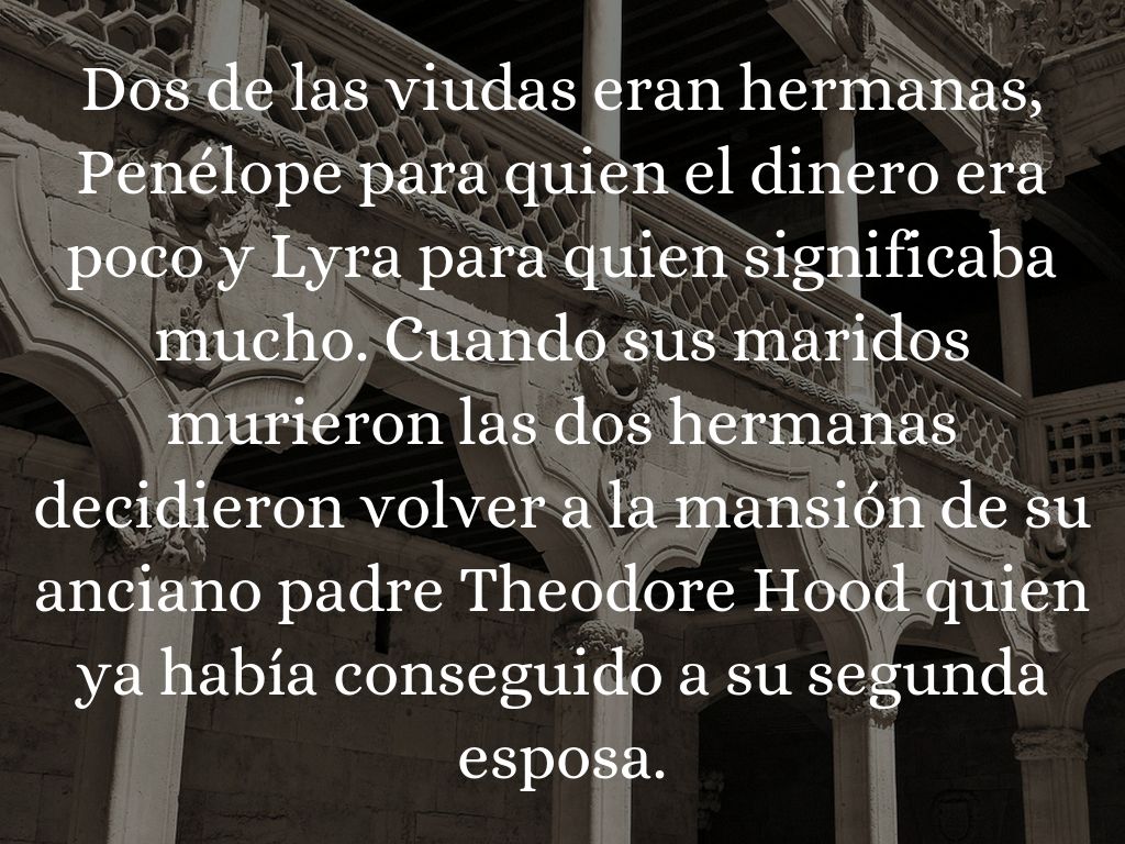 Dos de las viudas eran hermanas, Penélope para quien el dinero era poco y Lyra para quien significaba mucho. Cuando sus maridos murieron las dos hermanas decidieron volver a la mansión de su anciano padre Theodore Hood quien ya había conseguido a su segunda esposa.