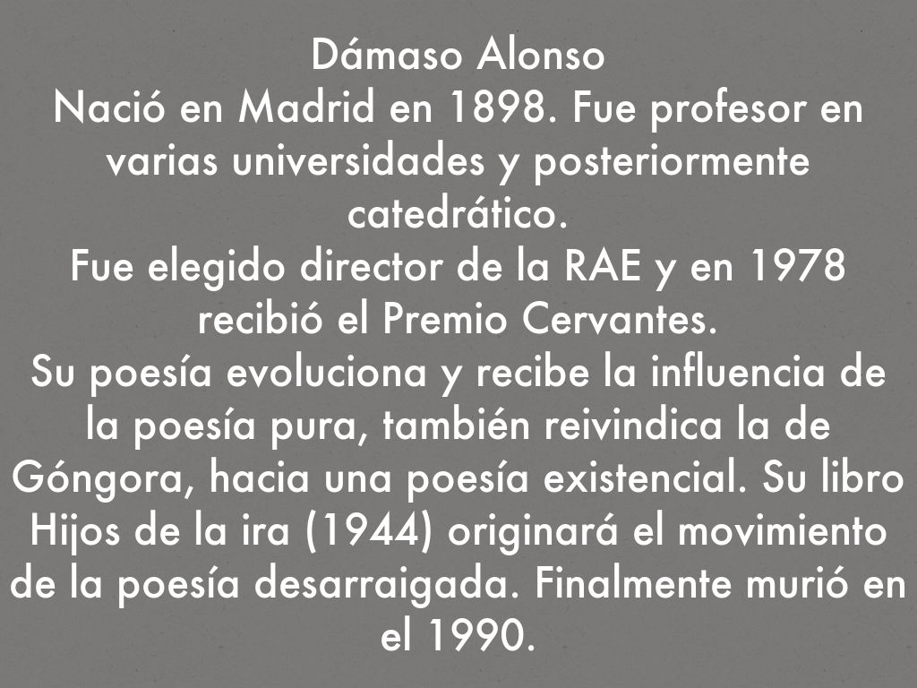 Su poesía evoluciona y recibe la influencia de la poesía pura, también reivindica la de Góngora, hacia una poesía existencial. Su libro Hijos de la ira (1944) originará el movimiento de la poesía desarraigada. Finalmente murió en el 1990.