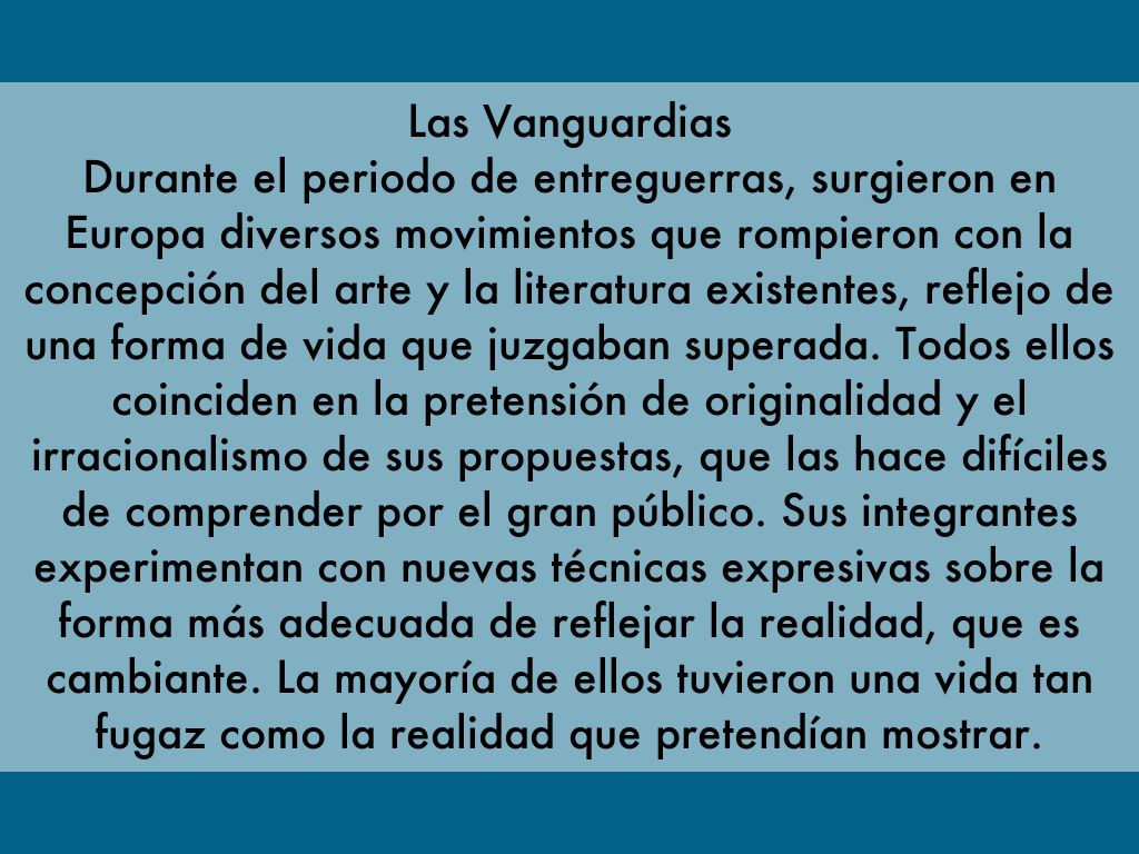 Durante el periodo de entreguerras, surgieron en Europa diversos movimientos que rompieron con la concepción del arte y la literatura existentes, reflejo de una forma de vida que juzgaban superada. Todos ellos coinciden en la pretensión de originalidad y el irracionalismo de sus propuestas, que las hace difíciles de comprender por el gran público. Sus integrantes experimentan con nuevas técnicas expresivas sobre la forma más adecuada de reflejar la realidad, que es cambiante. La mayoría de ellos tuvieron una vida tan fugaz como la realidad que pretendían mostrar.
