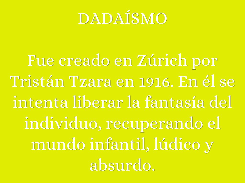 Fue creado en Zúrich por Tristán Tzara en 1916. En él se intenta liberar la fantasía del individuo, recuperando el mundo infantil, lúdico y absurdo.
