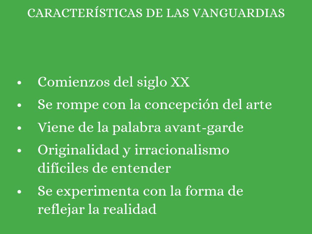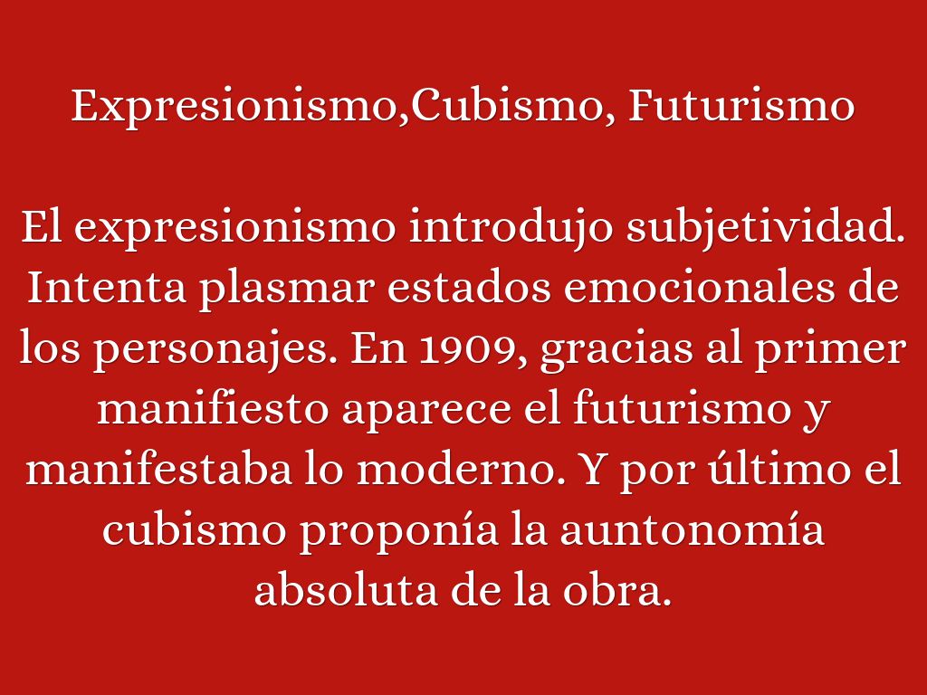 El expresionismo introdujo subjetividad. Intenta plasmar estados emocionales de los personajes. En 1909, gracias al primer manifiesto aparece el futurismo y manifestaba lo moderno. Y por último el cubismo proponía la auntonomía absoluta de la obra.