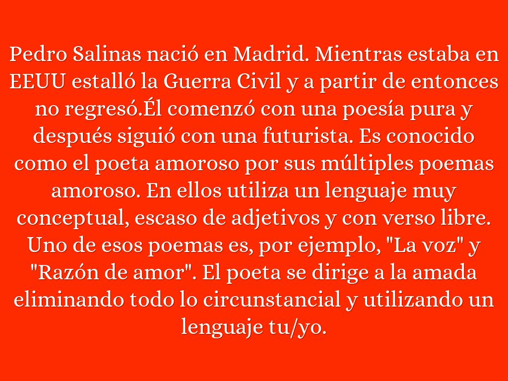 Pedro Salinas nació en Madrid. Mientras estaba en EEUU estalló la Guerra Civil y a partir de entonces no regresó.Él comenzó con una poesía pura y después siguió con una futurista. Es conocido como el poeta amoroso por sus múltiples poemas amoroso. En ellos utiliza un lenguaje muy conceptual, escaso de adjetivos y con verso libre. Uno de esos poemas es, por ejemplo, "La voz" y "Razón de amor". El poeta se dirige a la amada eliminando todo lo circunstancial y utilizando un lenguaje tu/yo.