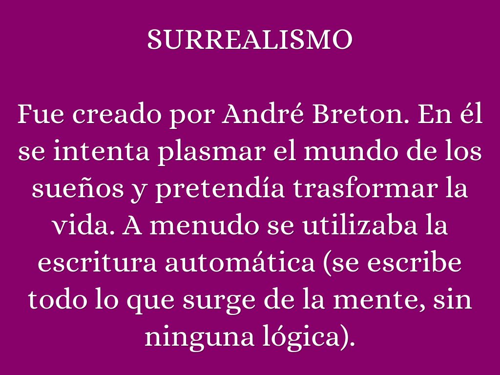 Fue creado por André Breton. En él se intenta plasmar el mundo de los sueños y pretendía trasformar la vida. A menudo se utilizaba la escritura automática (se escribe todo lo que surge de la mente, sin ninguna lógica).