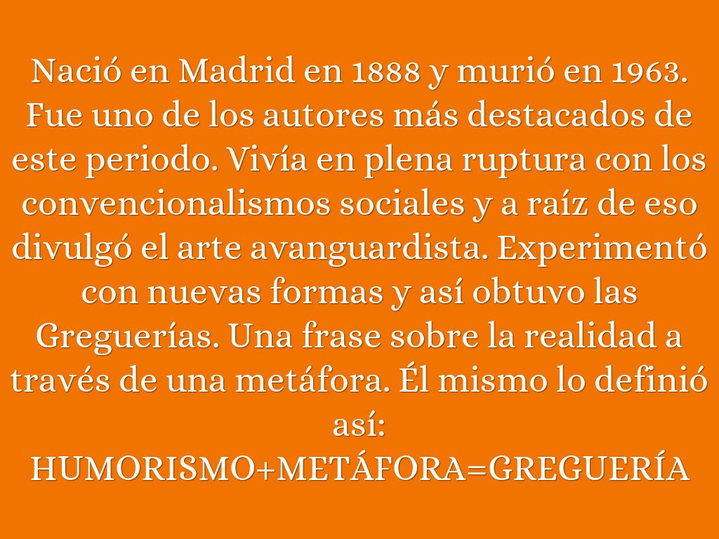 Nació en Madrid en 1888 y murió en 1963. Fue uno de los autores más destacados de este periodo. Vivía en plena ruptura con los convencionalismos sociales y a raíz de eso divulgó el arte avanguardista. Experimentó con nuevas formas y así obtuvo las Greguerías. Una frase sobre la realidad a través de una metáfora. Él mismo lo definió así: HUMORISMO+METÁFORA=GREGUERÍA