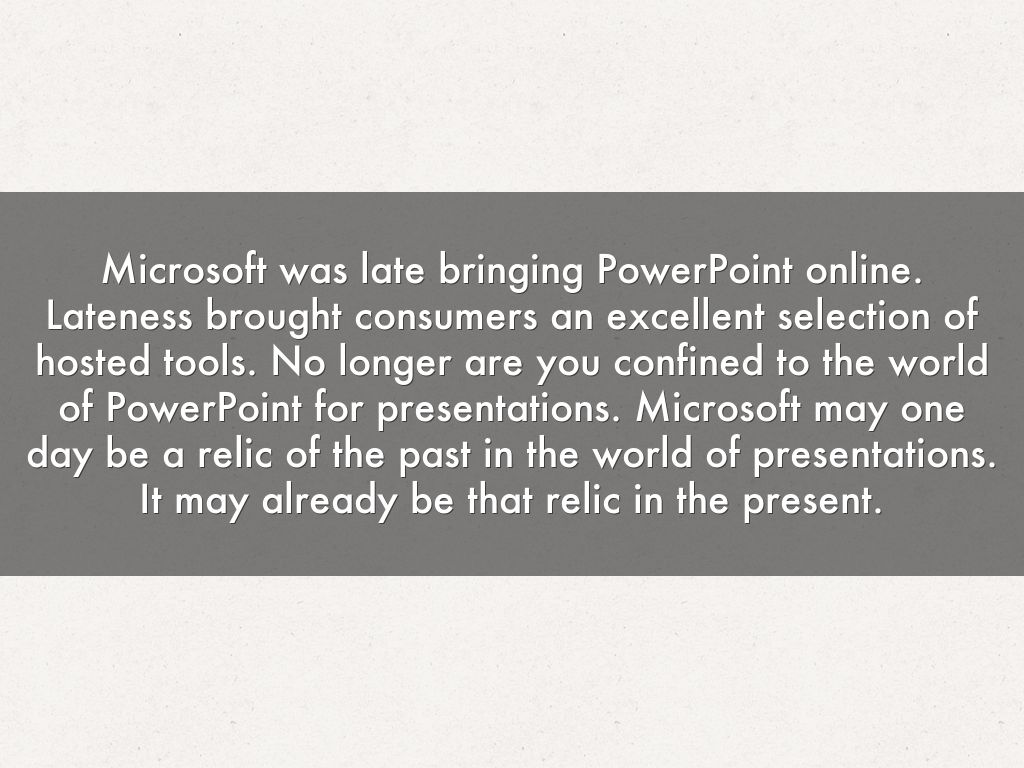 Microsoft was late bringing PowerPoint online. Lateness brought consumers an excellent selection of hosted tools. No longer are you confined to the world of PowerPoint for presentations. Microsoft may one day be a relic of the past in the world of presentations. It may already be that relic in the present.