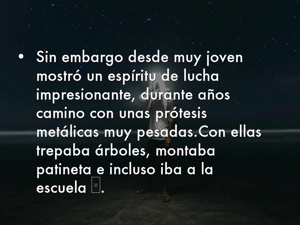 Sin embargo desde muy joven mostró un espíritu de lucha impresionante, durante años camino con unas prótesis metálicas muy pesadas.Con ellas trepaba árboles, montaba patineta e incluso iba a la escuela 🏫.