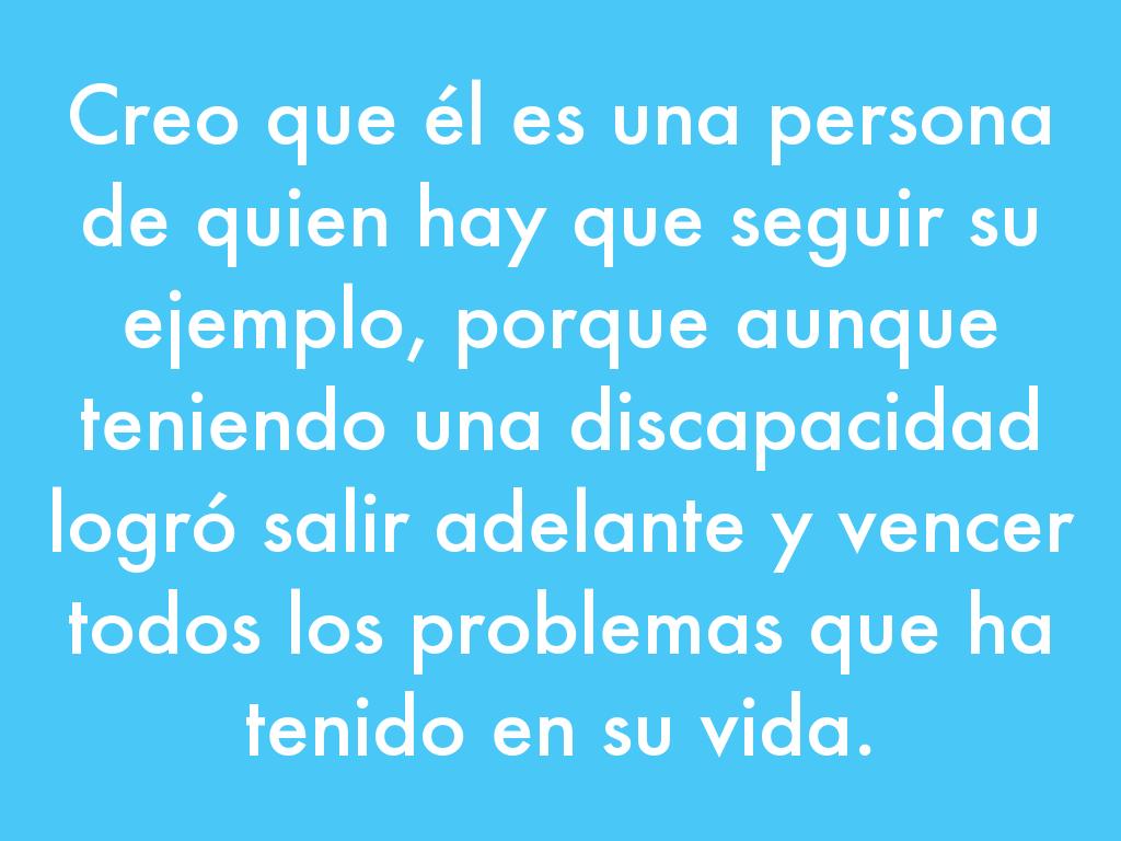 Creo que él es una persona de quien hay que seguir su ejemplo, porque aunque teniendo una discapacidad logró salir adelante y vencer todos los problemas que ha tenido en su vida.