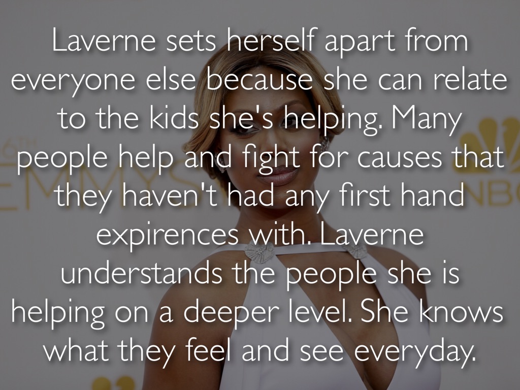 Laverne sets herself apart from everyone else because she can relate to the kids she's helping. Many people help and fight for causes that they haven't had any first hand expirences with. Laverne understands the people she is helping on a deeper level. She knows what they feel and see everyday.