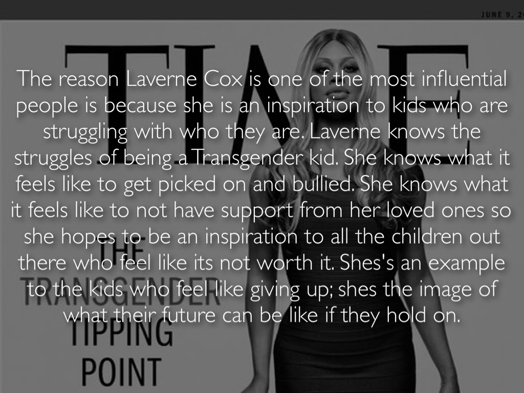 The reason Laverne Cox is one of the most influential people is because she is an inspiration to kids who are struggling with who they are. Laverne knows the struggles of being a Transgender kid. She knows what it feels like to get picked on and bullied. She knows what it feels like to not have support from her loved ones so she hopes to be an inspiration to all the children out there who feel like its not worth it. Shes's an example to the kids who feel like giving up; shes the image of what their future can be like if they hold on.