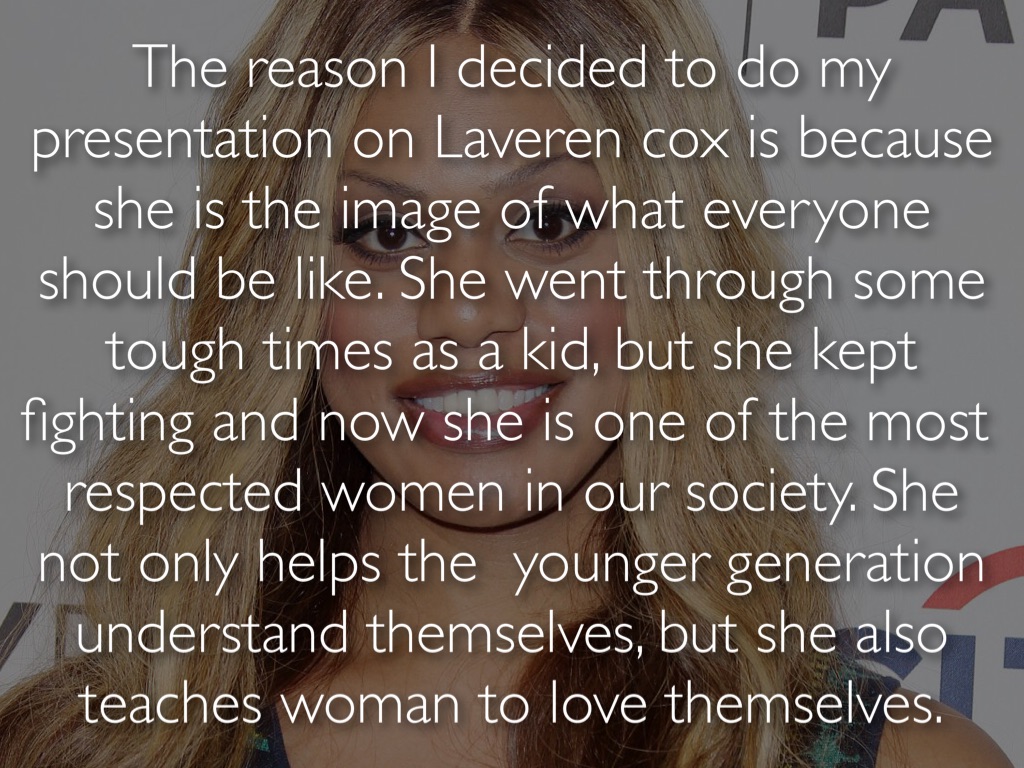 The reason I decided to do my presentation on Laveren cox is because she is the image of what everyone should be like. She went through some tough times as a kid, but she kept fighting and now she is one of the most respected women in our society. She not only helps the younger generation understand themselves, but she also teaches woman to love themselves.