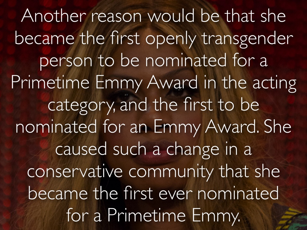 Another reason would be that she became the first openly transgender person to be nominated for a Primetime Emmy Award in the acting category, and the first to be nominated for an Emmy Award. She caused such a change in a conservative community that she became the first ever nominated