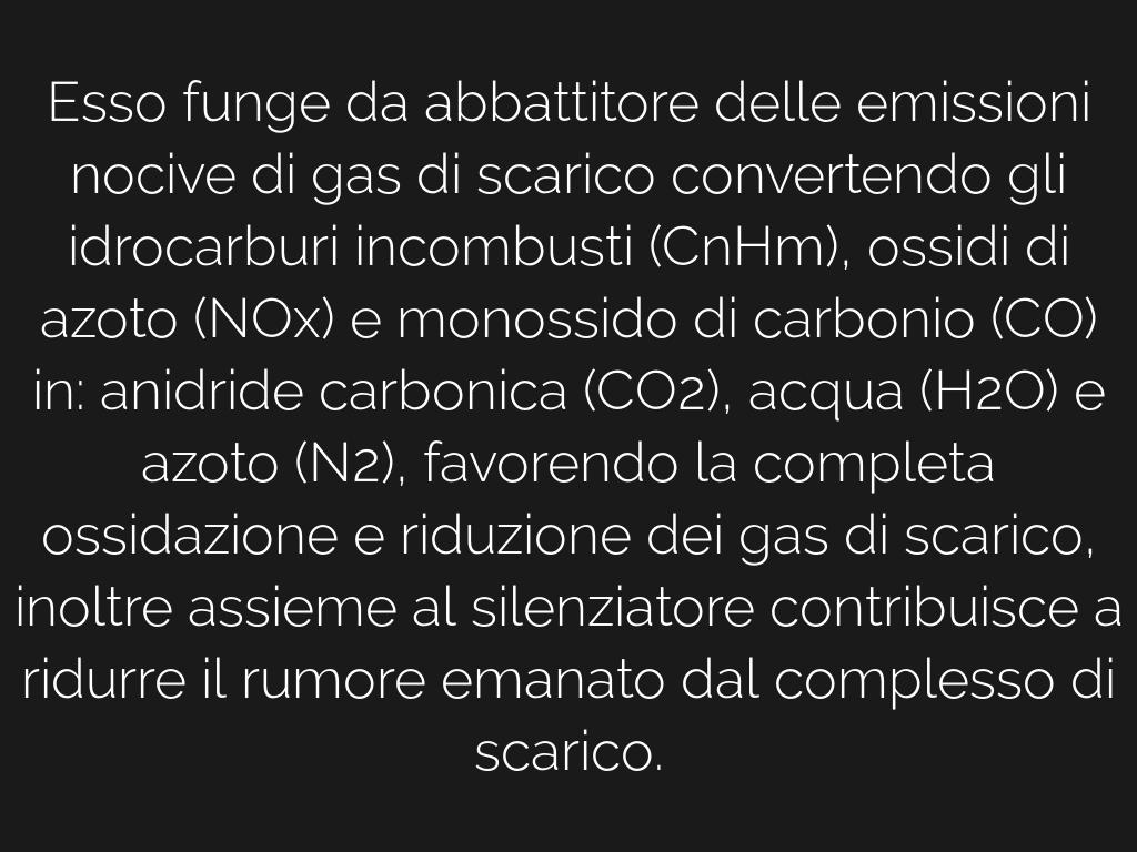 Esso funge da abbattitore delle emissioni nocive di gas di scarico convertendo gli idrocarburi incombusti (CnHm), ossidi di azoto (NOx) e monossido di carbonio (CO) in: anidride carbonica (CO2), acqua (H2O) e azoto (N2), favorendo la completa ossidazione e riduzione dei gas di scarico, inoltre assieme al silenziatore contribuisce a ridurre il rumore emanato dal complesso di scarico.